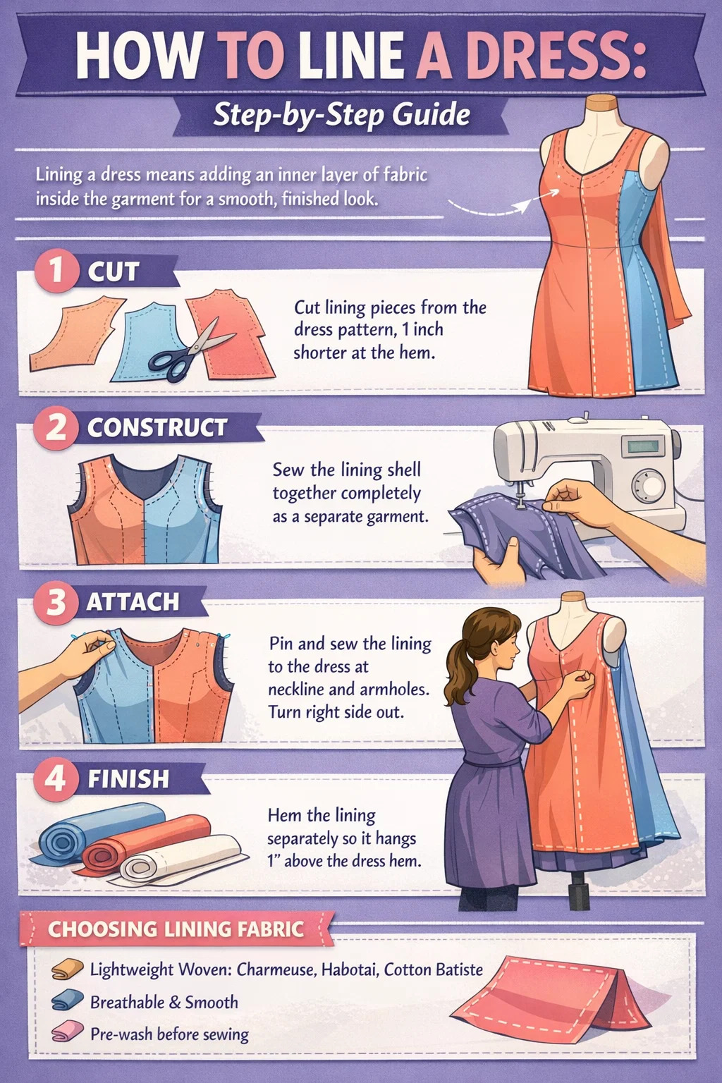 Çoğu ev dikişçisi temel elbise astarını dört aşamada tamamlar: kesin, inşa edin, ekleyin ve bitirin . İster yapısal bir korsajla ister dökümlü bir etekle çalışıyor olun, temel mantık aynıdır. Değişen şey, önce hangi dikişleri birleştireceğiniz ve etek ucunu nasıl kullandığınızdır.