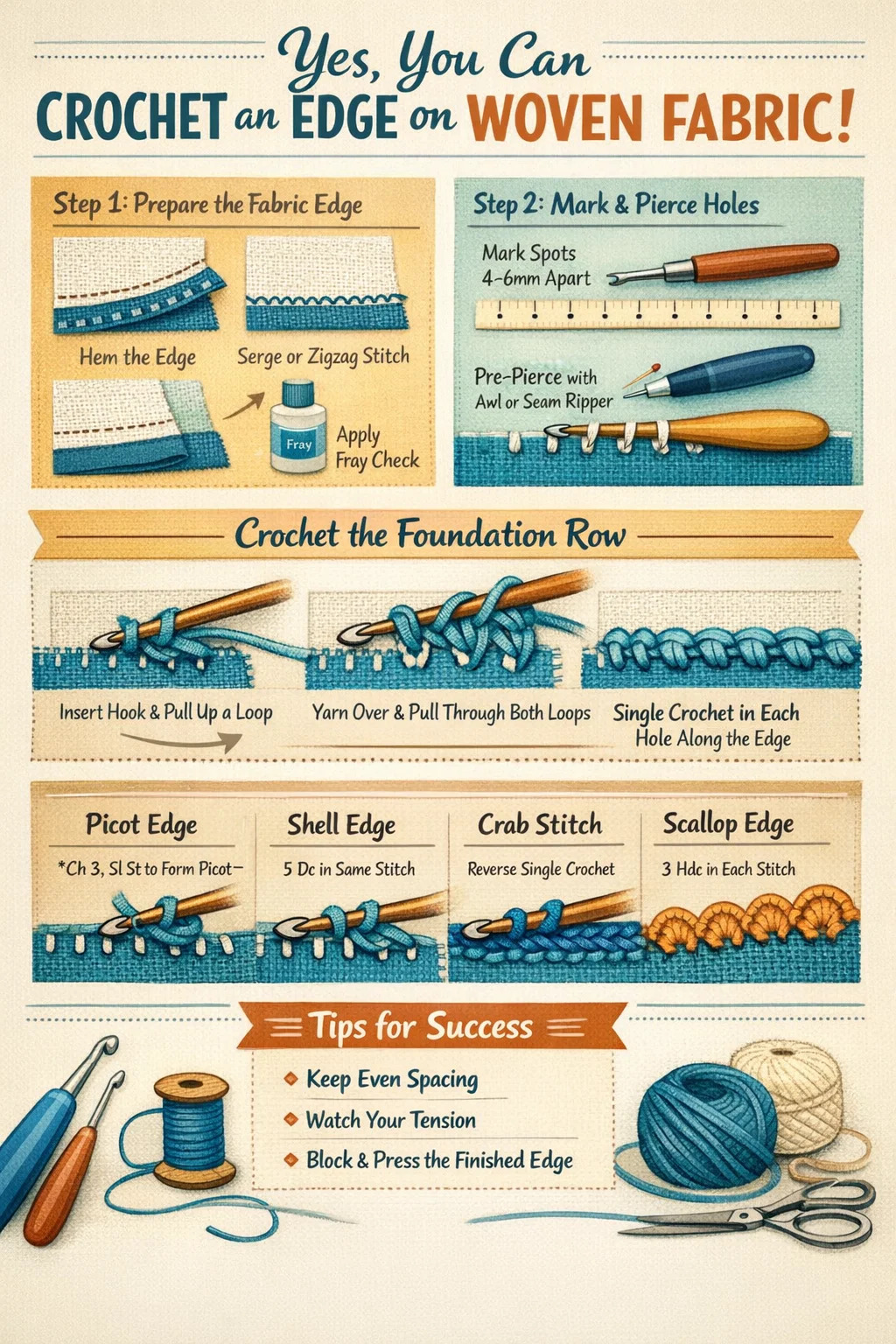 Örme kumaştan farklı olarak dokuma kumaşta kancayı takabileceğiniz doğal ilmekler yoktur. Bunun yerine, kumaşın kendisini delersiniz veya önceden hazırlanmış delikler üzerinde çalışırsınız; bu nedenle teknik ve hazırlık büyük fark yaratır. Mekaniği anladığınızda, pamuklu, keten, denim veya başka bir dokuma kumaş olsun, dokuma kumaşa tığ işi kenarı eklemek tekrarlanabilir, tatmin edici bir beceri haline gelir.