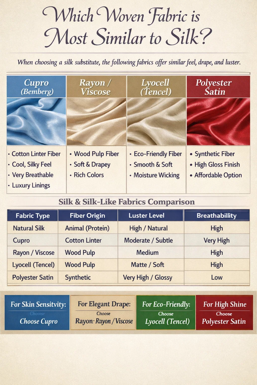 Bir arama yaparken dokuma kumaş Doğal ipeğin lüks hissini, parlaklığını ve dokusunu taklit eden en öne çıkan yarışmacılar Rayon, Cupro ve Liyosel (Tencel) . Bunlar arasında, Cupro yaygın olarak en yakın eşleşme olarak kabul ediliyor nefes alabilirlik ve ipeksi dokunuş açısından Saten Dokuma Polyester En yaygın, uygun fiyatlı sentetik alternatif olarak hizmet vermektedir. Bu kumaşlar belirli dokuma ipekböceklerinin ürettiği pürüzsüz protein liflerini taklit etme teknikleri.